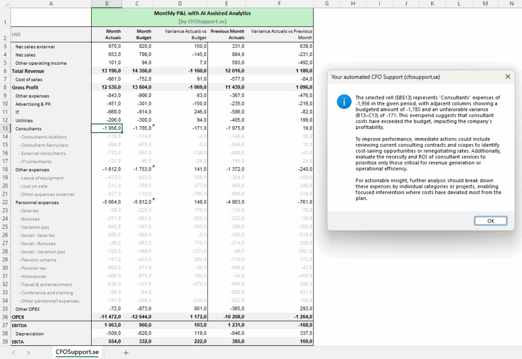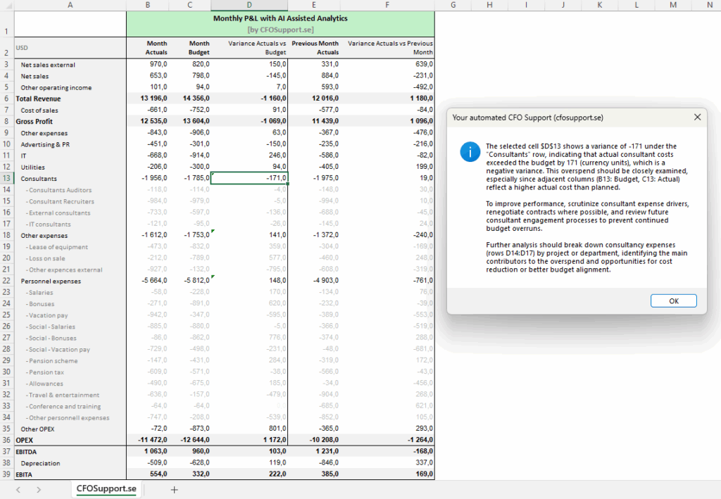 Example: You see a P&L with monthly data, previous month and budget values for Consultants row. Run the macro to get the automated response from AI in a message box. You can apply this to both Actuals, Bugdet or variance cells as shown below: